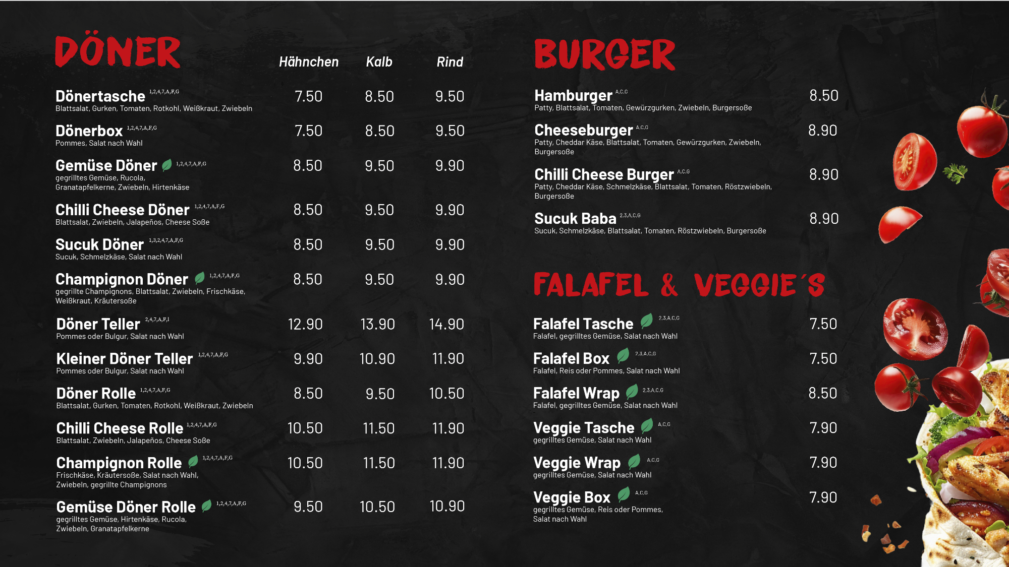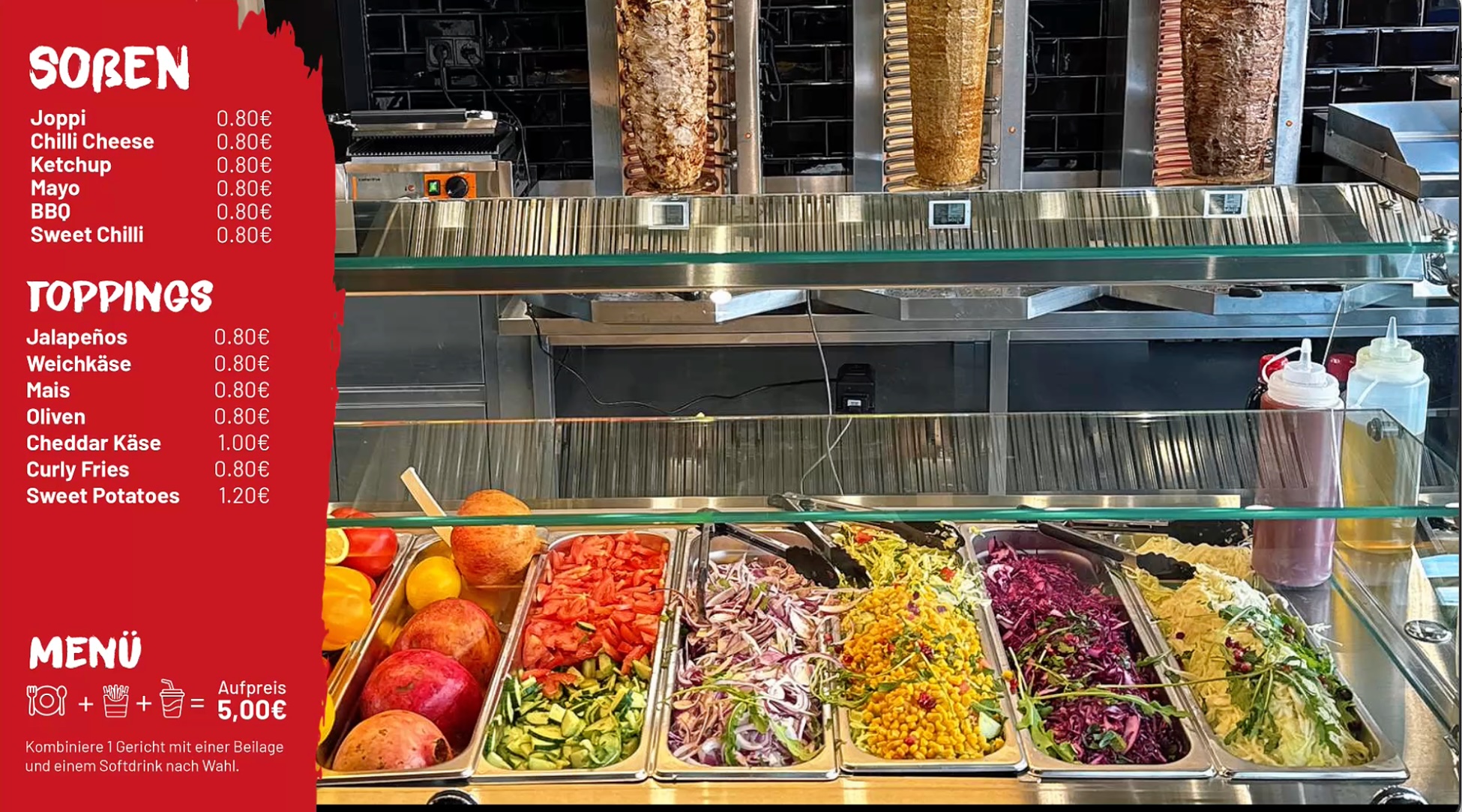 Wir bieten euch eine Vielzahl von Kreationen, um Euch auf eine kulinarische Reise durch die kurdische, türkische und deutsche Küche mitzunehmen - von Steak-, Kalb- und Hähnchendöner über Falafel plus Veggies bis zu Burger, Hähnchen sowie Linsensuppe nach überliefertem Rezept.